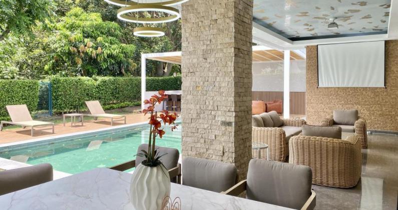 Discover refined luxury in this single-level residence nestled within a prestigious gated community in Santa Ana. The spacious living-dining area boasts soaring ceilings and abundant natural light, leading seamlessly to an expansive terrace ideal for outdoor entertaining. The integrated kitchen features Italian cabinetry, quartz countertops, and premium appliances. The Master Bedroom offers ample space and height, complemented by an opulent ensuite bathroom with porcelain finishes and a jacuzzi. Three additional bedrooms each feature their own bathrooms and hardwood floors. LED lighting, PVC windows, and central air conditioning enhance comfort throughout. Outside, a sprawling garden offers a serene retreat. Enjoy access to community amenities including a tennis court, swimming pool, gym, and more. Ideal for luxurious living and entertaining, this home epitomizes elegance and convenience.