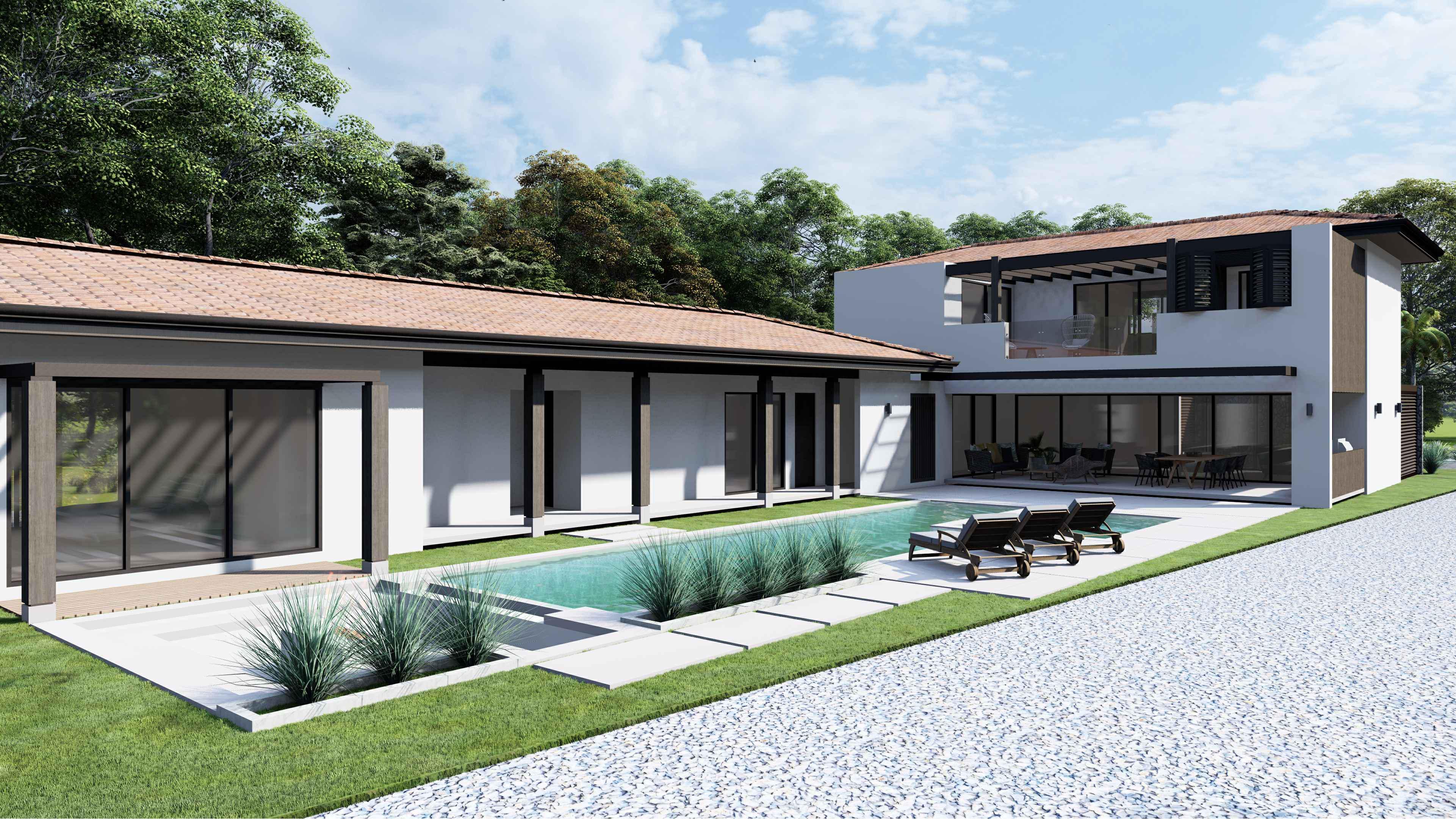 Located in the prestigious Reserva de Golf community within Hacienda Pinilla, this stunning residence blends contemporary tropical architecture with the serenity of Costa Rica’s lush landscape. Designed on an expansive, deep lot, the home offers open, integrated social spaces that seamlessly flow into vibrant gardens, creating a peaceful and luxurious retreat. The main level features a bright and airy living room, elegant dining area, and a designer kitchen, all connected to an expansive terrace, inviting pool, jacuzzi, and a cozy fire pit, ideal for unforgettable evenings under the Guanacaste sky. Surrounded by mature tropical gardens, these spaces offer natural ventilation and an immersive indoor-outdoor lifestyle. Five spacious bedrooms, three with walk-in closets, provide privacy and comfort. The master suite on the upper level is a sanctuary of its own, complete with a spa-style bathroom, outdoor jacuzzi, and a panoramic terrace with views of Hacienda Pinilla’s natural beauty. Thoughtful amenities include a two-car garage, service quarters, and ample storage, all designed for effortless living. Enjoy privileged access to Hacienda Pinilla’s world-class golf course, Beach Club, surf beaches, and nature trails, where every day invites new adventures, moments of connection, and unmatched coastal luxury.