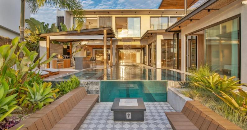 Located in the exclusive Valle del Sol community in Santa Ana, Casa Solea is a contemporary residence that blends the relaxed essence of a beach house with the sophistication of city living. Designed by renowned developers Motta & Vieto, the home offers a tropical ambiance, abundant natural light, and a seamless connection between indoor and outdoor spaces. A striking façade welcomes you with a drive-thru entrance, a central palm tree, and parking for four vehicles. The six-meter main door opens to a double-height foyer with elegant lighting and glass railings. The integrated social area—living, dining, and kitchen—features large-format marble floors and warm teak ceilings. The gourmet kitchen includes Alvic Spanish cabinetry, quartzite countertops, and high-end Italian Barazza appliances. The outdoor area is the heart of the home, with a lap pool finished in sukabumi stone, a gas-heated jacuzzi, waterfall feature, and a modern fire pit. The covered terrace with teak ceilings and a separate BBQ rancho with a Napoleon grill create an ideal entertainment space. The home offers four bedrooms, each with walk-in closet, en-suite bathroom, and balcony access. Additional highlights include smart lighting, Cortizo insulated windows, an integrated audio system, maid’s quarters, and a four-car garage. Casa Solea delivers a luxurious lifestyle in one of the most prestigious communities in the Central Valley.